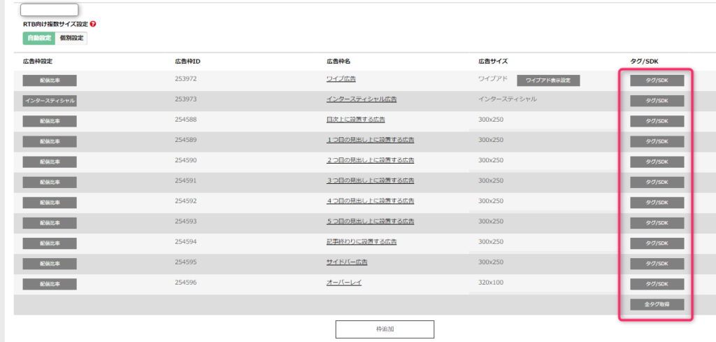 一度メディア追加した後は、下に表示されている「枠追加」から各広告枠を設置していってください。(下の画像参照)