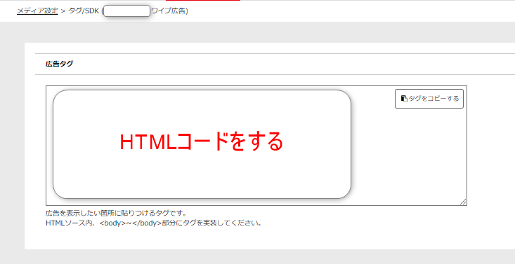 「メディア設定」⇒「ワイプ広告のタグ/SDK」をクリック⇒HTMLコードをコピーします。