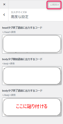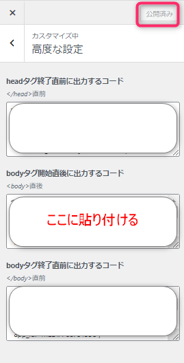 ワードプレスの管理画面⇒「外観」⇒「カスタマイズ」⇒「高度な設定」⇒「bodyタグ開始直後に出力するコード