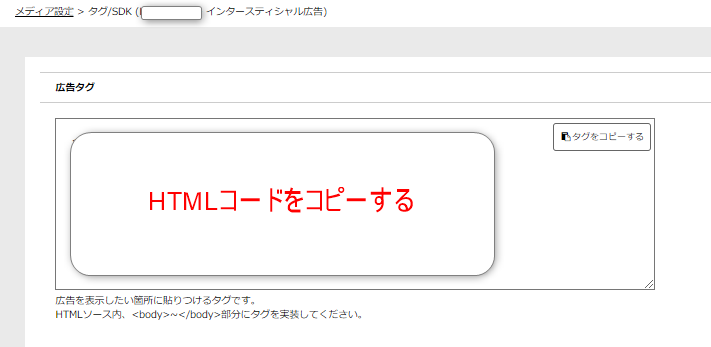 「メディア設定」⇒「インタースティシャル広告のタグ/SDK」をクリック⇒HTMLコードをコピーします。