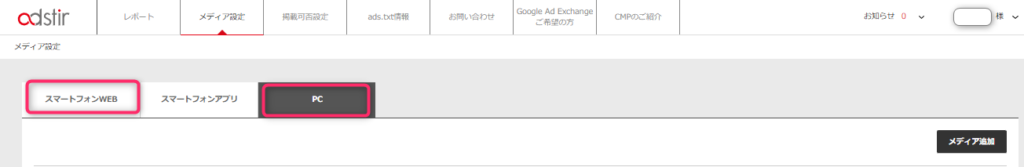 adstirの管理画面にログイン⇒「メディア設定」のタブを選択して⇒「メディア追加」をクリックします。