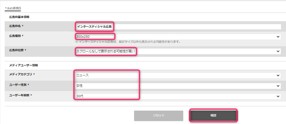 上記の「メディア基本情報」は最初だけ必要となります!次のインタースティシャル広告からは「メディア基本情報」の登録は必要ありません。