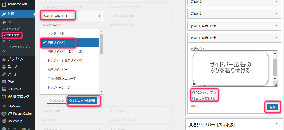 「外観」⇒「ウィジェット」⇒「[SWELL]広告コード」⇒「共通サイドバー」⇒「ウィジェットを追加」