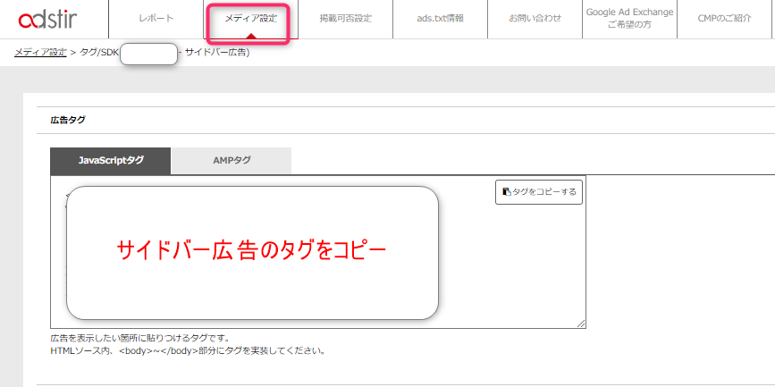 adstirの管理画面から「メディア設定」⇒「サイドバー広告タグ/SDK」⇒表示されたHTMLコードをコピーします。