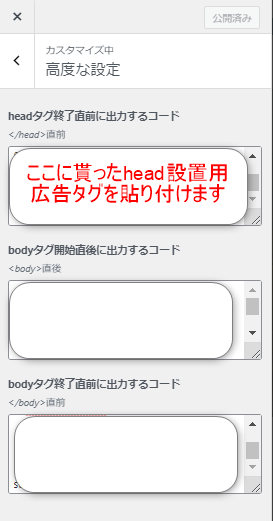 ADXに対応したタグを貰った場合「head設置用広告タグ」も追加する