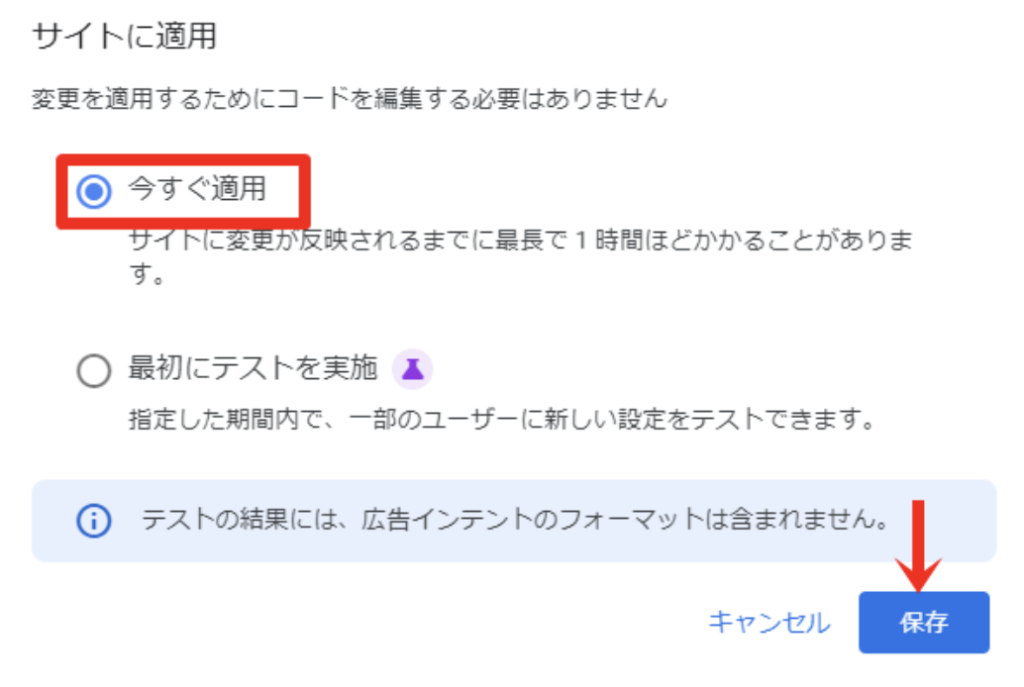 テスト期間を設けない場合、「今すぐ適用」を選択し「保存」を押せば、設定完了です!
