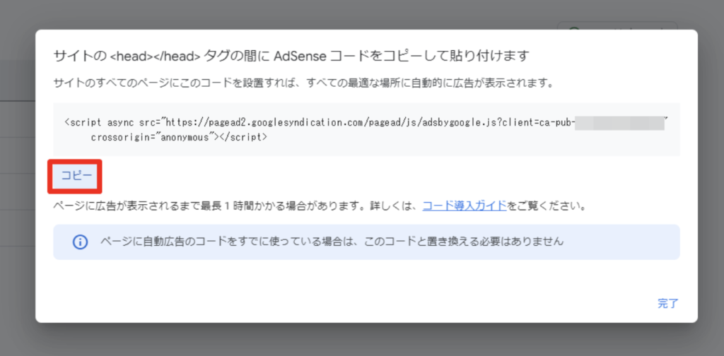 表示されたコードを「コピー」し、WordPressからhead内にコードを貼り付けていきましょう。