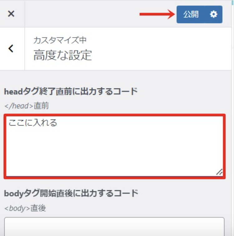 「外観」→「カスタマイズ」→「高度な設定」→「headタグ終了直前に出力するコード」内に設定していきましょう!