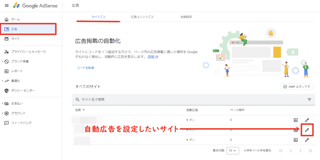 そして、自動広告を設定したいサイトの横にある編集ボタン(鉛筆マーク)をクリック。