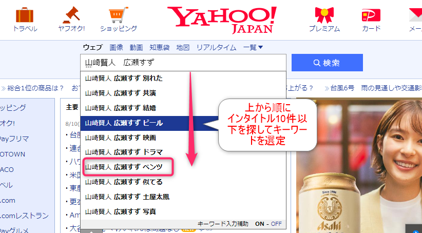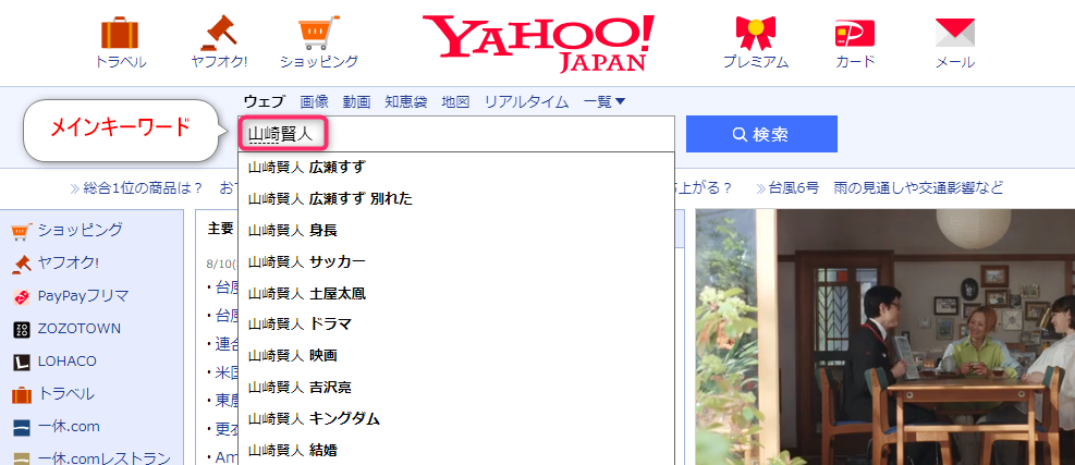 まずYahooの検索窓に、メインのキーワードを入れます。(例:山崎賢人)