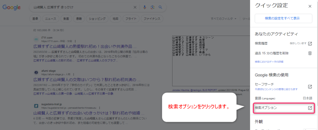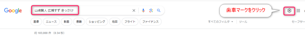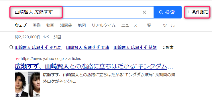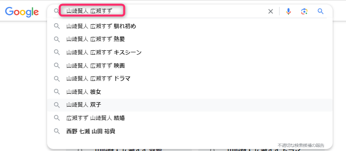 Yahoo虫眼鏡と同様にGoogleの虫眼鏡で「山崎賢人 広瀬すず」と検索していきます。