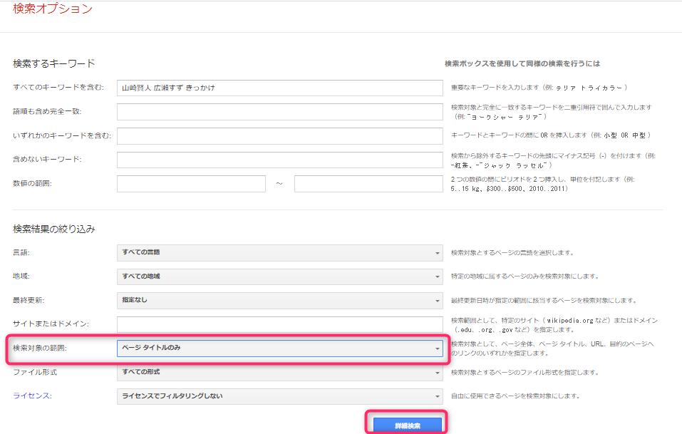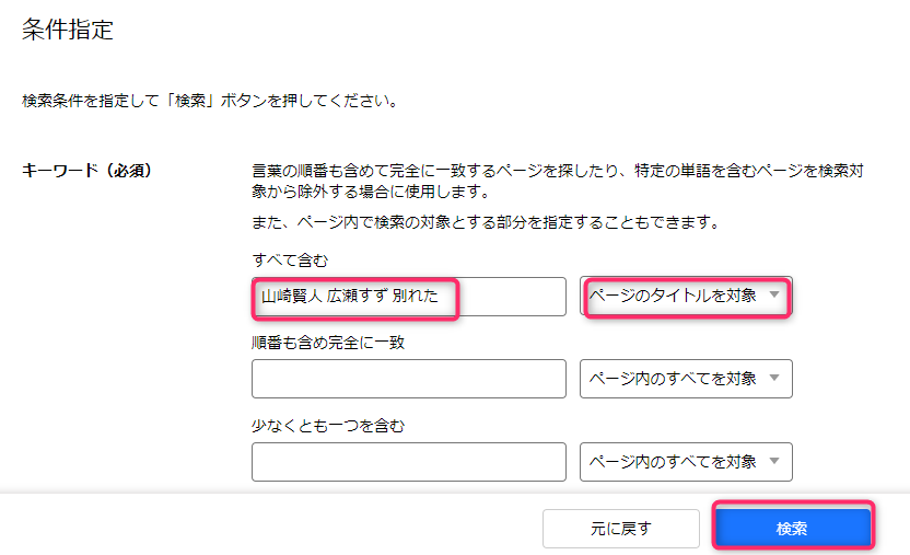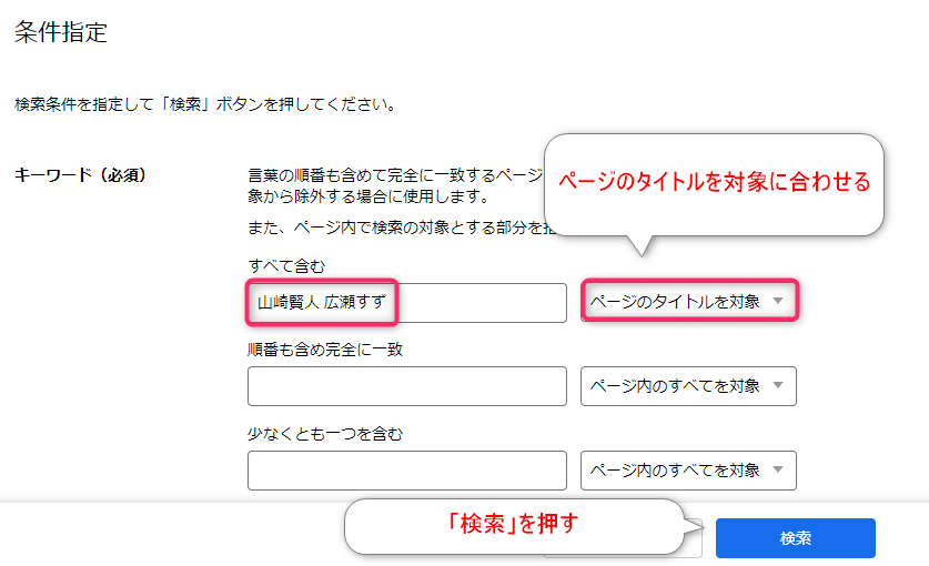 検索対象の範囲:「ページ タイトルのみ」を選択して