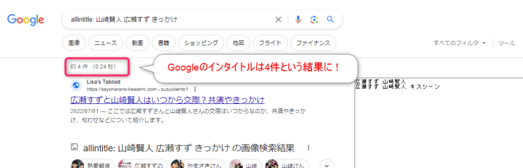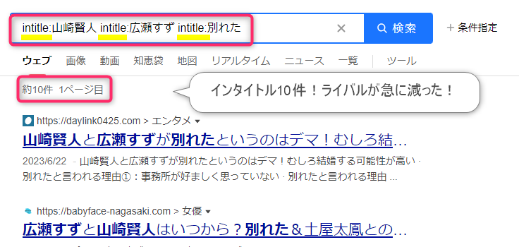 現時点で「山崎賢人 広瀬すず」のキーワードを使用した記事が何件あるかをインタイトル検索でチェックしていきます。