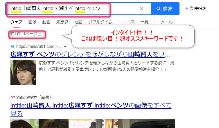インタイトル1件は最高です!このキーワードを使って記事を書いたら1ページ目の1位に来る可能性大です!