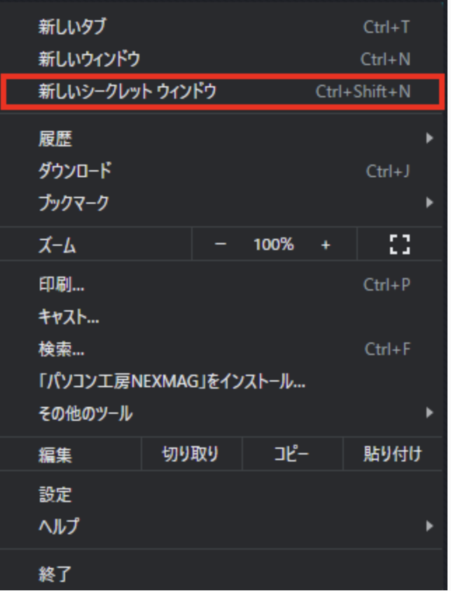 ③クリックすると、以下が展開されるので「新しいシークレットウインドウ」をクリック