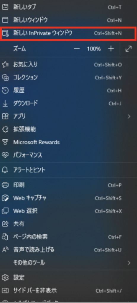 ③クリックすると、以下が展開されるので「新しいInPrivateウインドウ」をクリック
