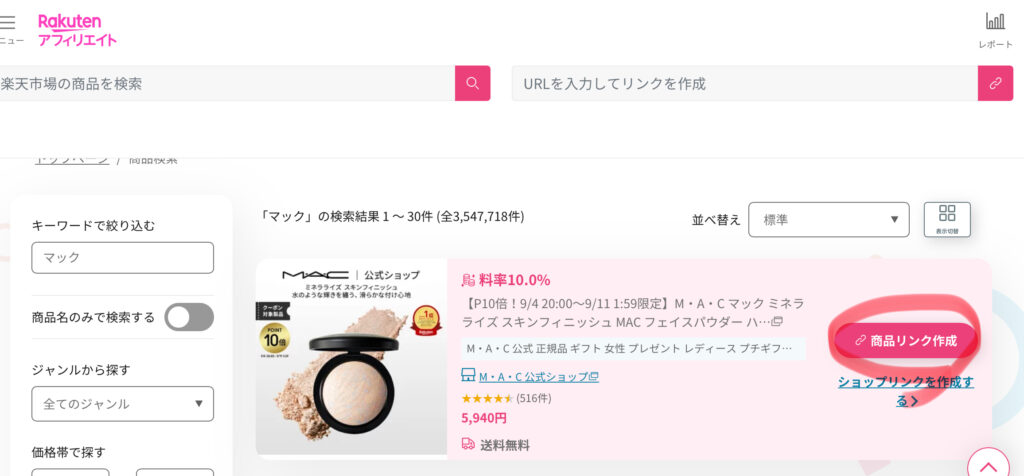 楽天市場内にアフィリエイトしたい商品の「ブランド公式ショップ」がある場合は、ショップリンクを作成したり、商品リンクを作成するのがおすすめです。