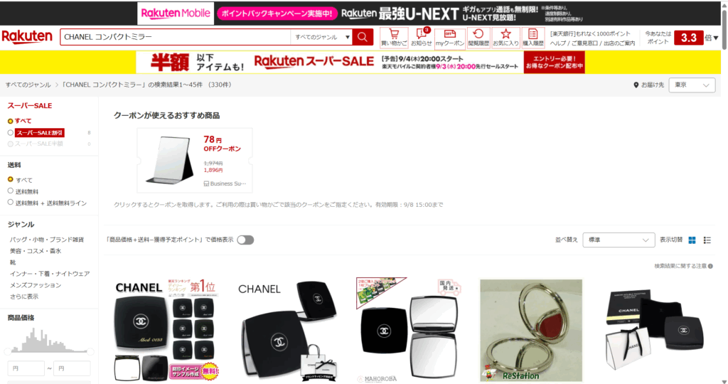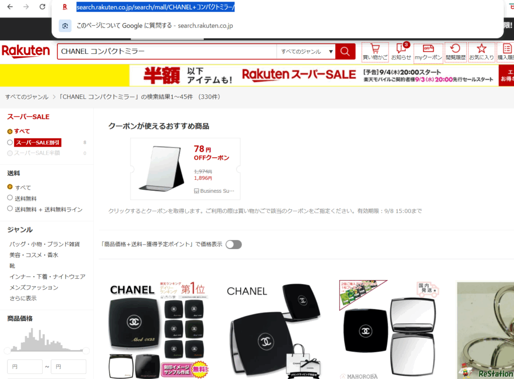 今回はブランド公式ショップのない「CHANEL コンパクトミラー」の検索結果画面をアフィリエイトする方法を解説します。