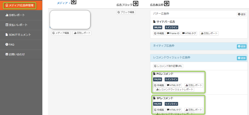「メディア/広告枠管理」⇒レコメンドウィジェット枠の「 PCレコメンド」と「SPレコメンド」を設置していきます。