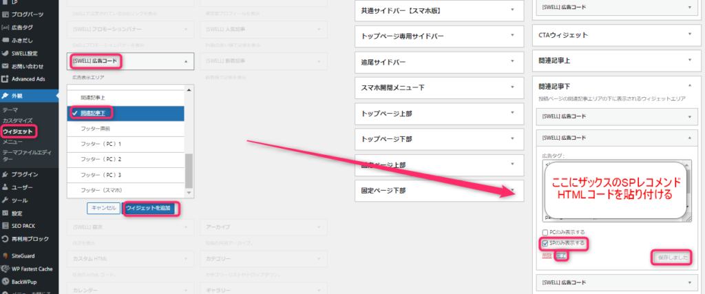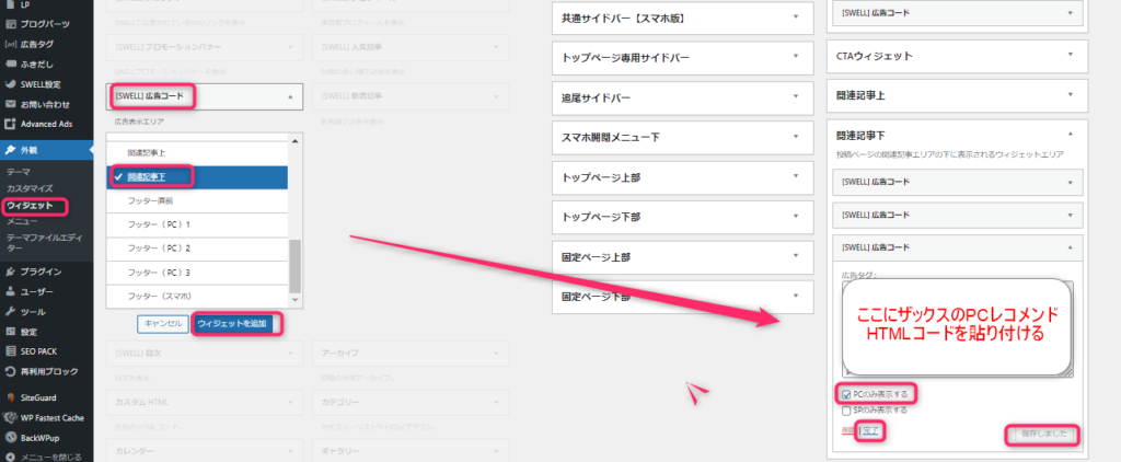ワードプレス管理画面⇒外観⇒ウィジェット⇒SWELL広告コード⇒共通サイドバー⇒ウィジェットを追加