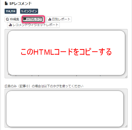 先程コピーした、ザックスのSPレコメンドのHTMLコードをタグを貼り付けます。